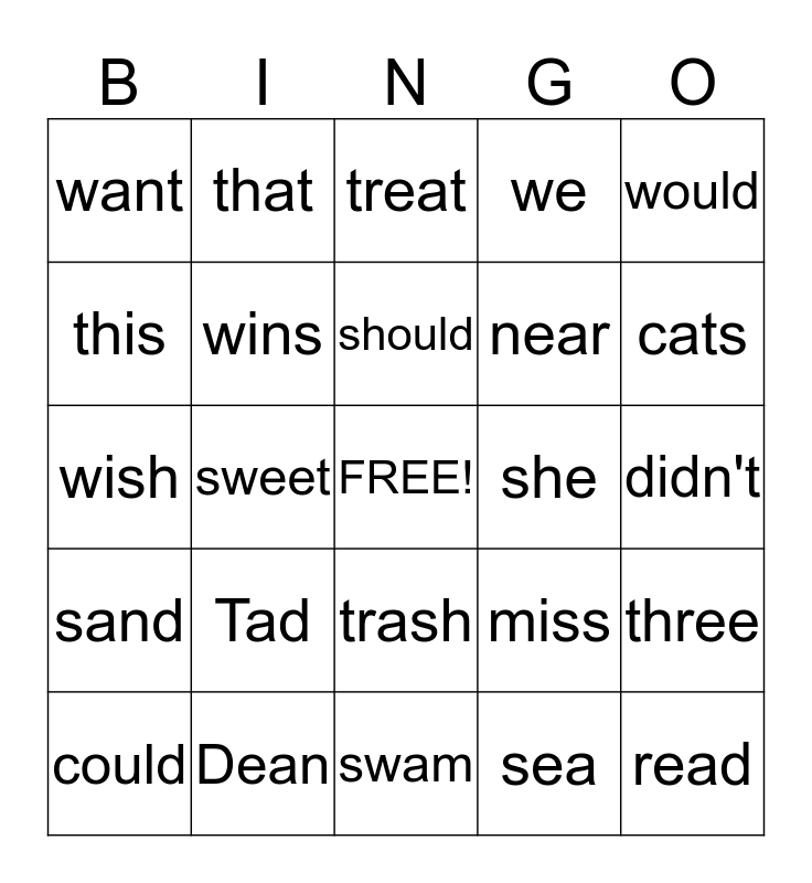 This bingo card has a free space and 24 words: Tad, Dean, should, could, would, want, this, that, she, trash, near, wish, miss, three, wins, sea, didn't, treat, cats, sweet, read, sand, we and swam.
