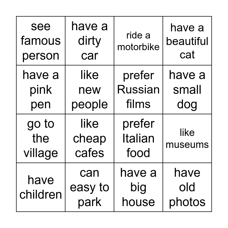 This bingo card has 16 words: can easy to park, like museums, ride a motorbike, see famous person, go to the village, have a dirty car, prefer Italian food, have a big house, have a pink pen, like new people, have children, have a beautiful cat, like cheap cafes, have a small dog, prefer Russian films and have old photos.