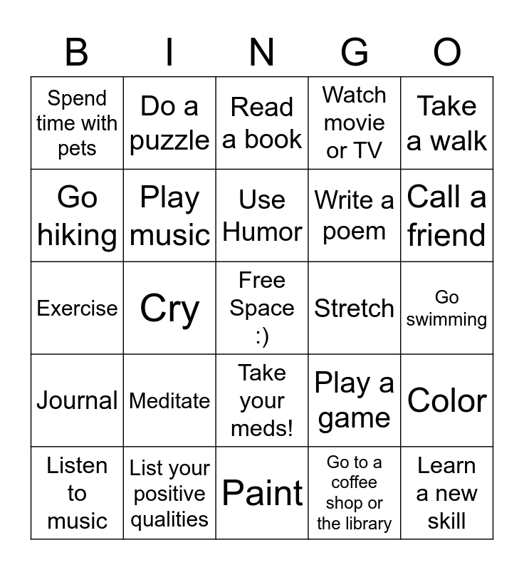 This bingo card has a free space and 25 words: Meditate, Paint, Use Humor, Listen to music, Take a walk, Spend time with pets, Go hiking, Do a puzzle, Stretch, Take your meds!, Write a poem, Exercise, Play a game, Color, Play music, Progressive relaxation, Go swimming, Read a book, Call a friend, Cry, Learn a new skill, List your positive qualities, Journal, Watch movie or TV and Go to a coffee shop or the library.