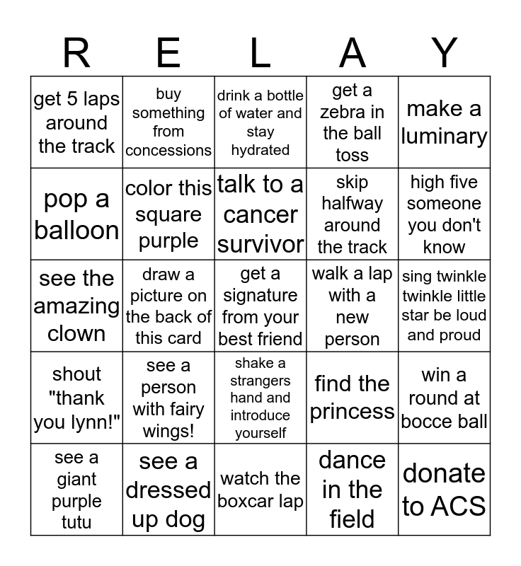 This bingo card has a free space and 24 words: see a person with fairy wings!, see a dressed up dog, talk to a cancer survivor, see a giant purple tutu, make a luminary, get 5 laps around the track, pop a balloon, buy something from concessions, walk a lap with a new person, shake a strangers hand and introduce yourself, skip halfway around the track, see the amazing clown, find the princess, win a round at bocce ball, color this square purple, dance in the field, sing twinkle twinkle little star be loud and proud, drink a bottle of water and stay hydrated, high five someone you don't know, draw a picture on the back of this card, donate to ACS, shout "thank you lynn!", get a zebra in the ball toss and watch the boxcar lap.