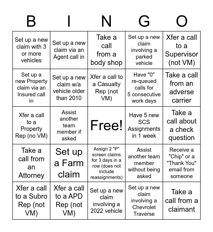 This bingo card has a free space and 24 words: Set up a Farm claim, Xfer a call to a APD Rep (not VM), Xfer a call to a Casualty Rep (not VM), Xfer a call to a Subro Rep (not VM), Xfer a call to a Supervisor (not VM), Set up a new claim with 3 or more vehicles, Set up a new Property claim via an Insured call in, Set up a new claim via an Agent call in, Have 5 new SCS Assignments in 1 week, Assign 2 "P" screen claims for 3 days in a row (does not include reassignments), Have "0" re-queued calls for 5 consecutive work days, Xfer a call to a Property Rep (no VM), Assist another team member without being asked, Receive a "Chip" or a "Thank You" email from someone, Set up a new claim w/a vehicle older than 2010, Set up a new claim involving a Chevrolet Traverse, Take a call about a check question, Take a call from a body shop, Take a call from an adverse carrier, Assist another team member if asked, Take a call from a claimant, Take a call from an Attorney, Set up a new claim involving a parked vehicle and Set up a new claim involving a 2022 vehicle.