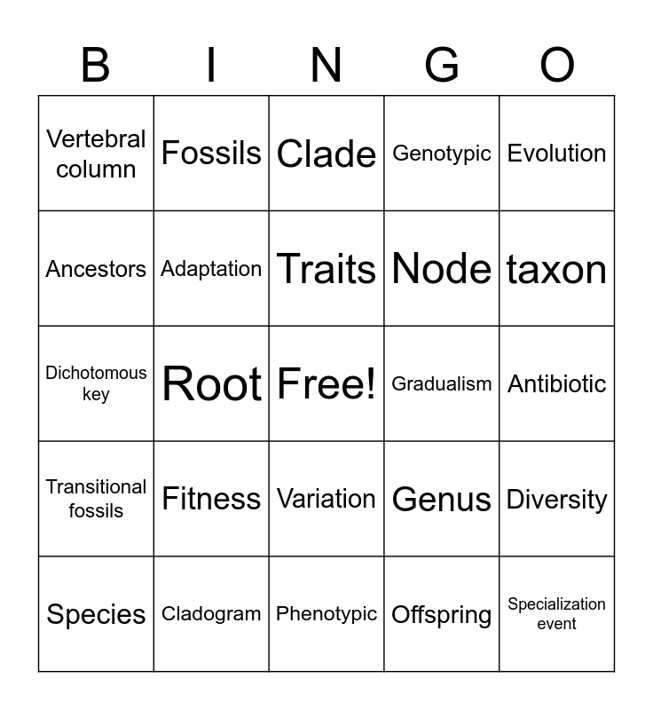 This bingo card has a free space and 24 words: Fitness, Cladogram, Traits, Species, Evolution, Vertebral column, Ancestors, Fossils, Gradualism, Variation, Node, Dichotomous key, Genus, Diversity, Adaptation, Offspring, Antibiotic, Clade, taxon, Root, Specialization event, Transitional fossils, Genotypic and Phenotypic.