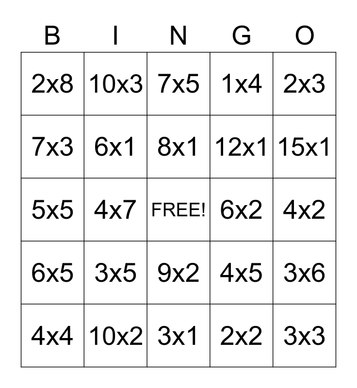 This bingo card has a free space and 24 words: 3x5, 10x2, 8x1, 4x4, 2x3, 2x8, 7x3, 10x3, 6x2, 9x2, 12x1, 5x5, 4x5, 3x6, 6x1, 2x2, 4x2, 7x5, 15x1, 4x7, 3x3, 6x5, 1x4 and 3x1.