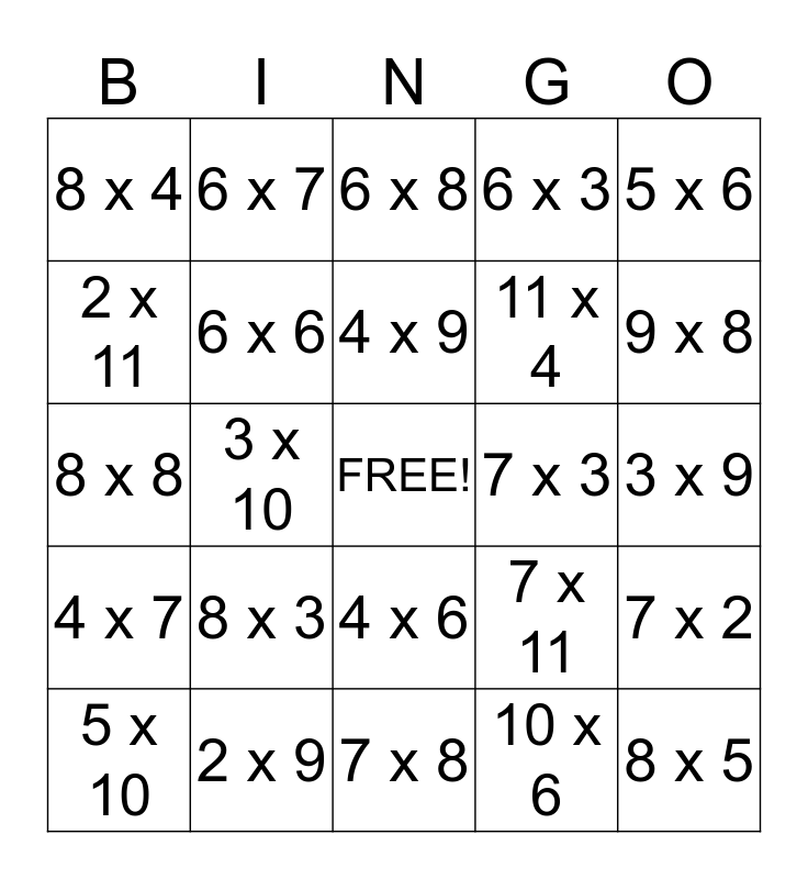 This bingo card has a free space and 24 words: 8 x 3, 2 x 9, 4 x 9, 5 x 10, 5 x 6, 8 x 4, 2 x 11, 6 x 7, 7 x 3, 4 x 6, 11 x 4, 8 x 8, 7 x 11, 7 x 2, 6 x 6, 10 x 6, 3 x 9, 6 x 8, 9 x 8, 3 x 10, 8 x 5, 4 x 7, 6 x 3 and 7 x 8.