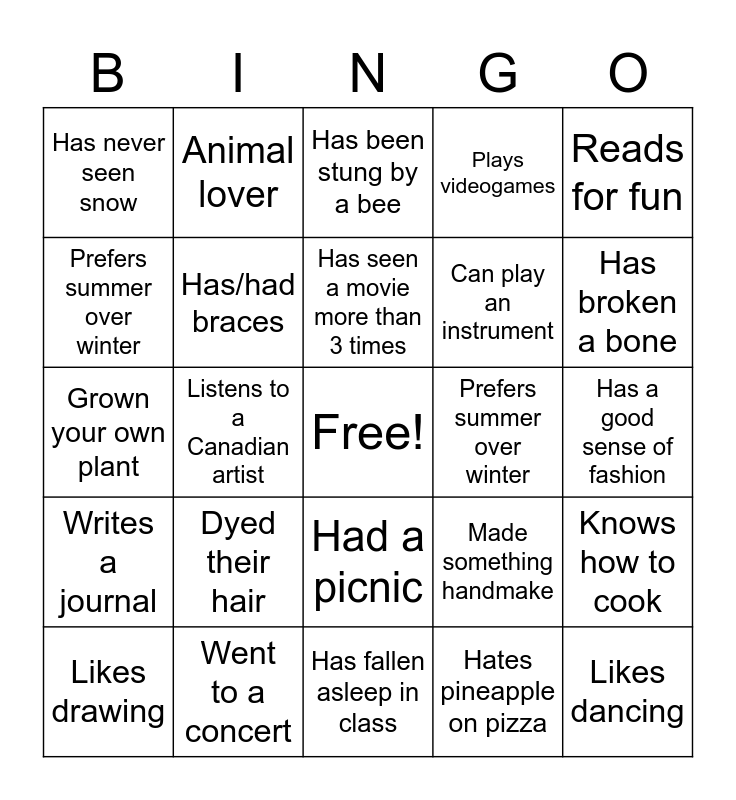 This bingo card has a free space and 29 words: Likes drawing, Has been to the lake, Listens to a Canadian artist, Likes sports, Has never seen snow, Has been stung by a bee, Has/had braces, Dyed their hair, Prefers summer over winter, Went to a concert, Has a good sense of fashion, Likes dancing, Has fallen asleep in class, Hates pineapple on pizza, Has broken a bone, Has a food allergy, Had a picnic, Writes a journal, Reads for fun, Grown your own plant, Made something handmake, Have been thought younger/older than your actual age, Can play an instrument, Prefers summer over winter, Plays videogames, Animal lover, Knows how to cook, Has seen a movie more than 3 times and Had a sleepover.