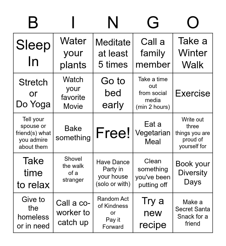 This bingo card has a free space and 24 words: Shovel the walk of a stranger, Call a co-worker to catch up, Go to bed early, Give to the homeless or in need, Take a Winter Walk, Sleep In, Stretch or Do Yoga, Water your plants, Eat a Vegetarian Meal, Have Dance Party in your house (solo or with), Take a time out from social media (min 2 hours), Tell your spouse or friend(s) what you admire about them, Clean something you've been putting off, Book your Diversity Days, Watch your favorite Movie, Try a new recipe, Write out three things you are proud of yourself for, Meditate at least 5 times, Exercise, Bake something, Make a Secret Santa Snack for a friend, Take time to relax, Call a family member and Random Act of Kindness or Pay it Forward.