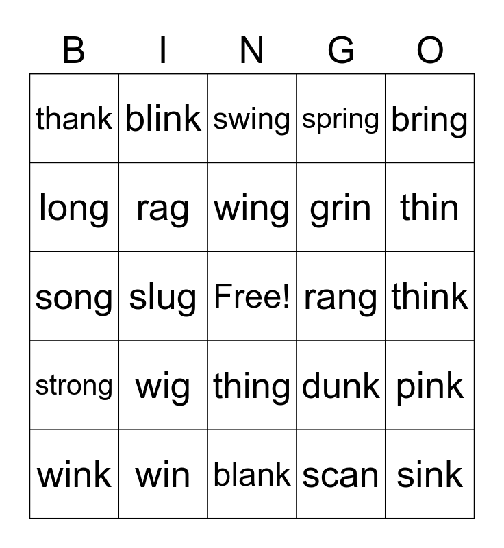 This bingo card has a free space and 24 words: wig, win, wing, wink, bring, thank, long, blink, rang, thing, grin, song, dunk, pink, rag, scan, think, swing, thin, slug, sink, strong, spring and blank.