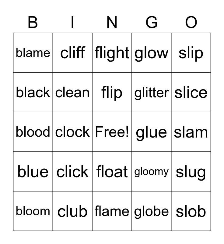 This bingo card has a free space and 34 words: blend, clap, flag, glad, slam, black, clean, flame, glitter, slob, blood, cliff, globe, sleep, blue, clock, float, glue, slug, bloom, club, flute, glow, slice, blanket, click, flight, glare, slip, blame, clown, flip, gloomy and slime.