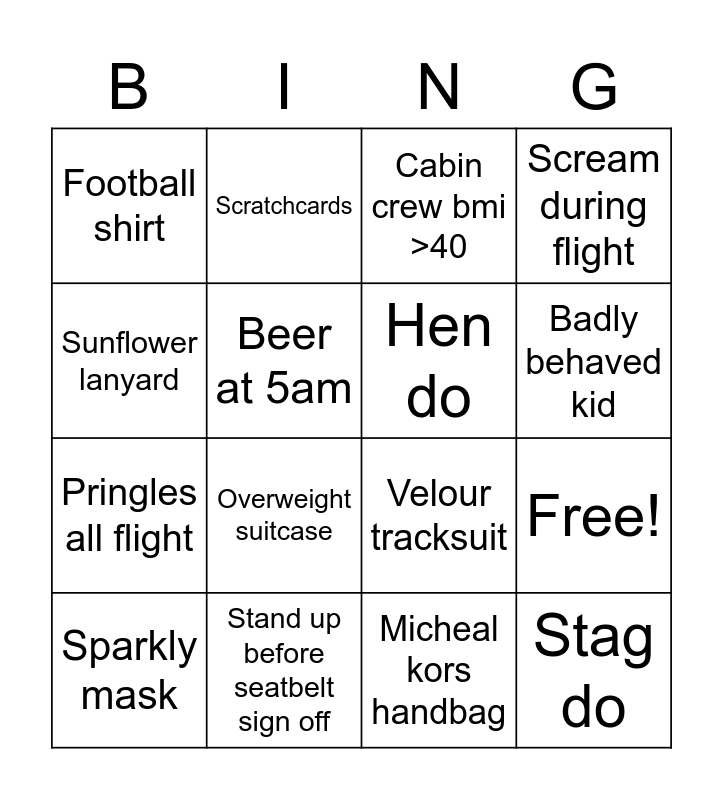This bingo card has 20 words: Free!, Sharpie eyebrows, Cabin crew bmi >40, BMI>50, Sparkly mask, Sunflower lanyard, Stand up before seatbelt sign off, Football shirt, Pringles all flight, Scratchcards, Overweight suitcase, Velour tracksuit, Beer at 5am, Stag do, Hen do, Skirt too short, Badly behaved kid, Scream during flight, Micheal kors handbag and On phone inflight.