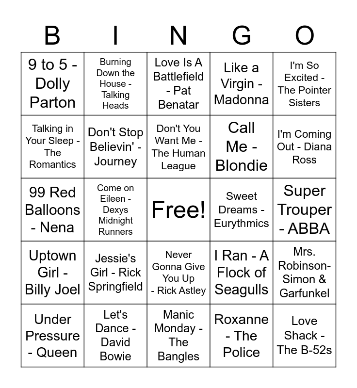 This bingo card has a free space and 39 words: Take on Me - a-ha, Africa - Toto, Tainted Love - Soft Cell, Don't Stop Believin' - Journey, Under Pressure - Queen, Never Gonna Give You Up - Rick Astley, Don't You Want Me - The Human League, West End Girls - The Pet Shop Boys, I'm So Excited - The Pointer Sisters, Uptown Girl - Billy Joel, Come on Eileen - Dexys Midnight Runners, Like a Virgin - Madonna, Love Shack - The B-52s, Super Trouper - ABBA, Sweet Dreams - Eurythmics, Jessie's Girl - Rick Springfield, Billie Jean - Michael Jackson, 9 to 5 - Dolly Parton, Maneater - Hall & Oates, I Ran - A Flock of Seagulls, Talking in Your Sleep - The Romantics, Manic Monday - The Bangles, Call Me - Blondie, I'm Coming Out - Diana Ross, Gloria - Laura Branigan, Mad About You - Belinda Carlisle, Centerfold - The J. Geils Band, White Wedding - Billy Idol, The Safety Dance - Men Without Hats, Burning Down the House - Talking Heads, Girls Just Wanna Have Fun - Cyndi Lauper, Edge of Seventeen - Stevie Nicks, Love Is A Battlefield - Pat Benatar, Let's Dance - David Bowie, Roxanne - The Police, The Chain - Fleetwood Mac, Mrs. Robinson- Simon & Garfunkel, 99 Red Balloons - Nena and September - Earth, Wind & Fire.