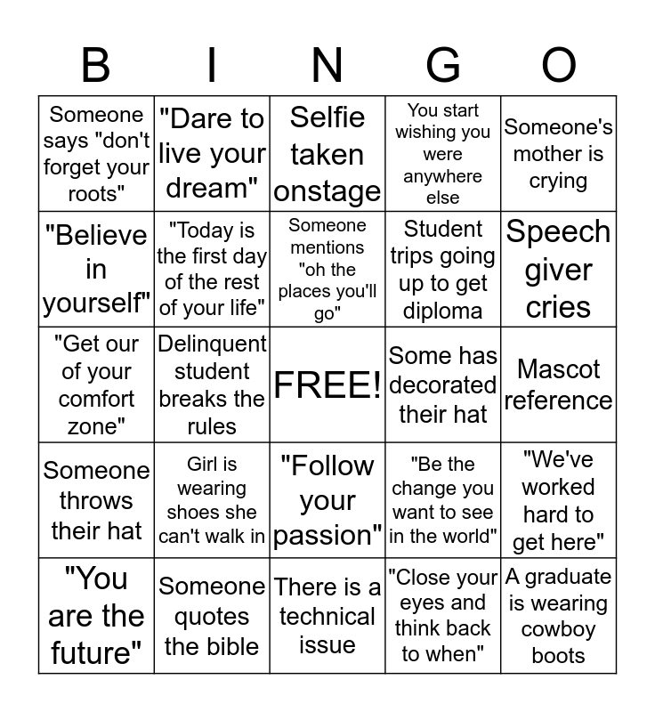This bingo card has a free space and 24 words: Girl is wearing shoes she can't walk in, Someone quotes the bible, Someone mentions "oh the places you'll go", "You are the future", Someone's mother is crying, Someone says "don't forget your roots", "Believe in yourself", "Dare to live your dream", Some has decorated their hat, "Follow your passion", Student trips going up to get diploma, "Get our of your comfort zone", "Be the change you want to see in the world", "We've worked hard to get here", "Today is the first day of the rest of your life", "Close your eyes and think back to when", Mascot reference, Selfie taken onstage, Speech giver cries, Delinquent student breaks the rules, A graduate is wearing cowboy boots, Someone throws their hat, You start wishing you were anywhere else and There is a technical issue.