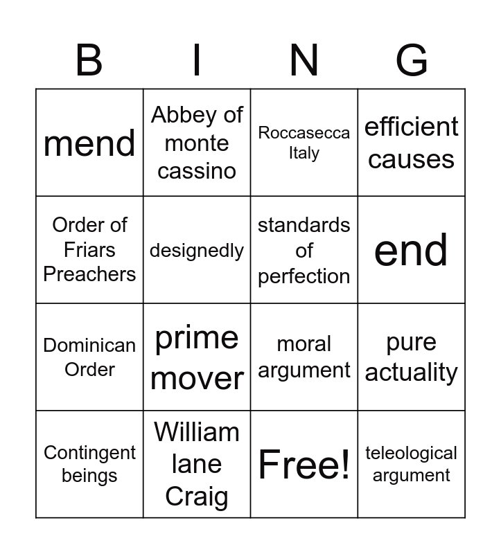 This bingo card has 17 words: Free!, Contingent beings, Roccasecca Italy, mend, prime mover, efficient causes, pure actuality, standards of perfection, end, designedly, William lane Craig, moral argument, Order of Friars Preachers, Abbey of monte cassino, Dominican Order, commit and teleological argument.
