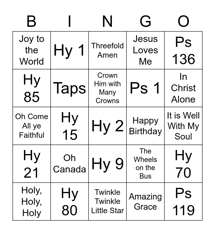 This bingo card has a free space and 29 words: Holy, Holy, Holy, Hy 8, Hy 15, Ps 103, Joy to the World, Threefold Amen, Taps, Oh Canada, Happy Birthday, Hy 80, It is Well With My Soul, Ps 119, Twinkle Twinkle Little Star, Amazing Grace, In Christ Alone, Hy 7, Hy 9, Hy 21, Ps 136, Oh Come All ye Faithful, The Wheels on the Bus, Hy 53, Ps 1, Hy 85, Jesus Loves Me, Hy 1, Hy 70, Crown Him with Many Crowns and Hark the Herald Angels Sing.