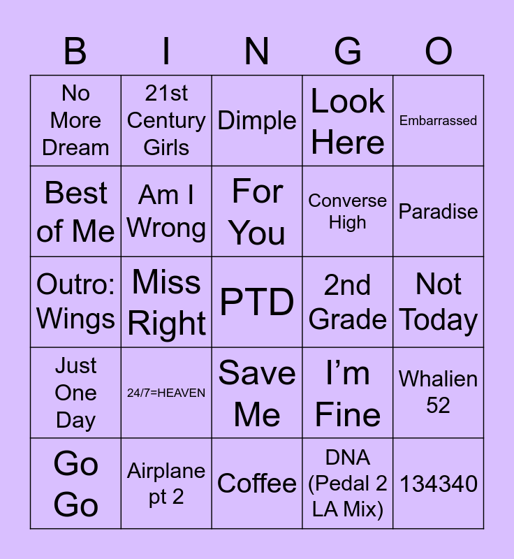 This bingo card has a free space and 24 words: 24/7=HEAVEN, Airplane pt 2, For You, Go Go, Embarrassed, No More Dream, Best of Me, 21st Century Girls, 2nd Grade, Save Me, Converse High, Outro: Wings, I’m Fine, Whalien 52, Am I Wrong, DNA (Pedal 2 LA Mix), Not Today, Dimple, Paradise, Miss Right, 134340, Just One Day, Look Here and Coffee.