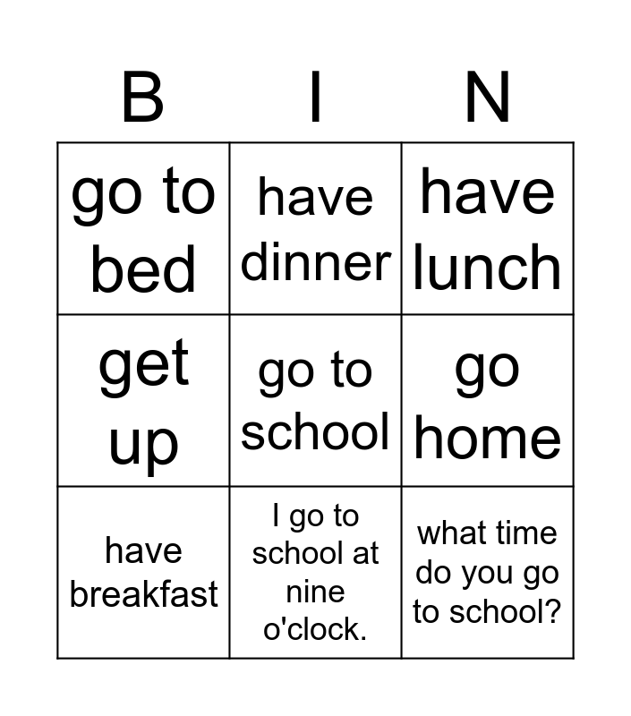 This bingo card has 9 words: have breakfast, have lunch, have dinner, get up, go to bed, go home, go to school, what time do you go to school? and I go to school at nine o'clock..