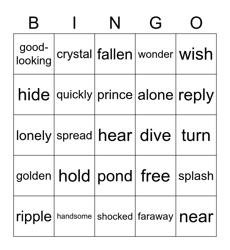 This bingo card has a free space and 26 words: pond, faraway, prince, handsome, wish, good-looking, hide, crystal, turn, free, alone, lonely, splash, ripple, spread, across, wonder, golden, fallen, near, reply, shocked, dive, hold, quickly and ugly.
