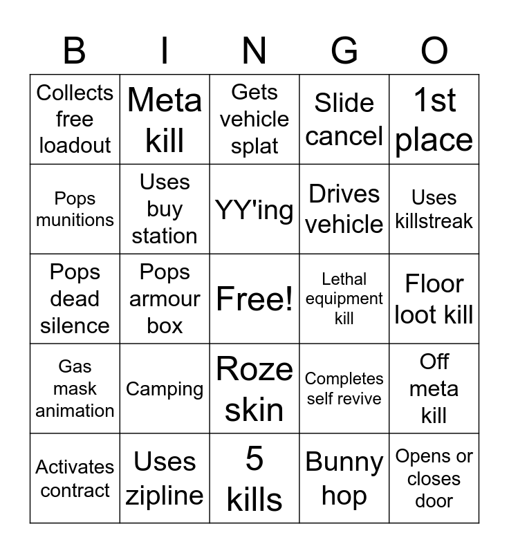 This bingo card has a free space and 24 words: Camping, Uses zipline, YY'ing, Activates contract, 1st place, Collects free loadout, Pops munitions, Meta kill, Lethal equipment kill, Roze skin, Drives vehicle, Pops dead silence, Completes self revive, Off meta kill, Uses buy station, Bunny hop, Floor loot kill, Gets vehicle splat, Uses killstreak, Pops armour box, Opens or closes door, Gas mask animation, Slide cancel and 5 kills.