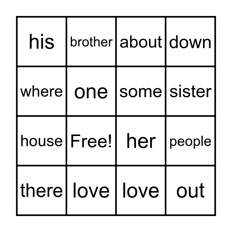 This bingo card has 18 words: Free!, out, about, his, her, down, there, brother, sister, house, love, where, people, one, some, many, love and has.