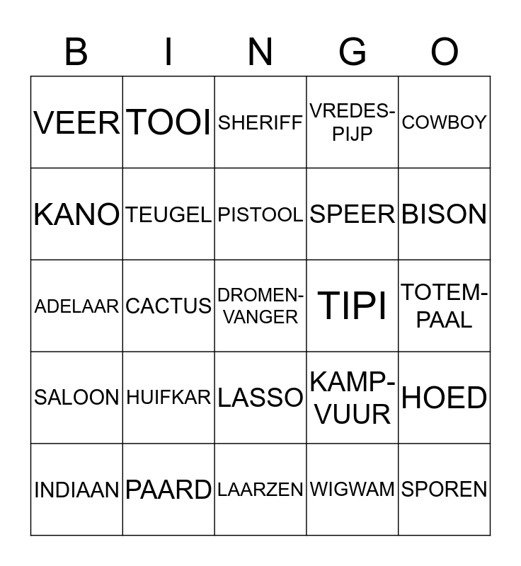 This bingo card has a free space and 24 words: HUIFKAR, PAARD, PISTOOL, INDIAAN, COWBOY, VEER, KANO, TOOI, TIPI, LASSO, SPEER, ADELAAR, KAMP- VUUR, HOED, TEUGEL, WIGWAM, TOTEM- PAAL, SHERIFF, BISON, CACTUS, SPOREN, SALOON, VREDES- PIJP and LAARZEN.