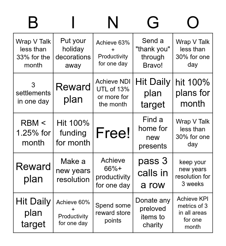 This bingo card has a free space and 24 words: Make a new years resolution, Achieve 60% + Productivity for one day, Achieve NDI UTL of 13% or more for the month, Hit Daily plan target, Wrap V Talk less than 30% for one day, Wrap V Talk less than 33% for the month, 3 settlements in one day, Put your holiday decorations away, Find a home for new presents, Achieve 66%+ productivity for one day, Hit Daily plan target, RBM < 1.25% for month, pass 3 calls in a row, keep your new years resolution for 3 weeks, Reward plan, Donate any preloved items to charity, Wrap V Talk less than 30% for one day, Achieve 63% + Productivity for one day, hit 100% plans for month, Hit 100% funding for month, Achieve KPI metrics of 3 in all areas for one month, Reward plan, Send a "thank you" through Bravo! and Spend some reward store points.