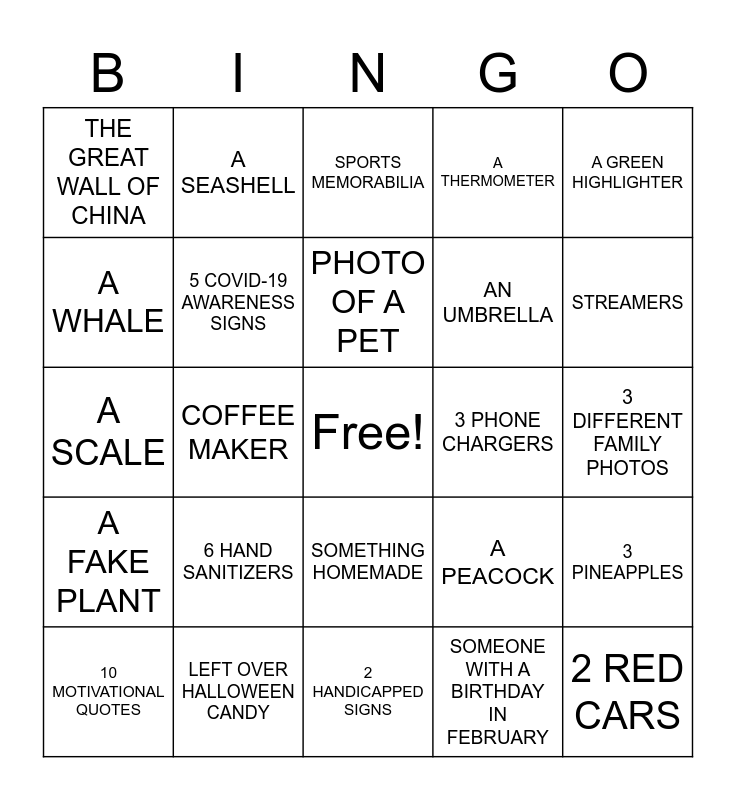 This bingo card has a free space and 24 words: 6 HAND SANITIZERS, LEFT OVER HALLOWEEN CANDY, PHOTO OF A PET, 10 MOTIVATIONAL QUOTES, A GREEN HIGHLIGHTER, THE GREAT WALL OF CHINA, A WHALE, A SEASHELL, 3 PHONE CHARGERS, SOMETHING HOMEMADE, AN UMBRELLA, A SCALE, A PEACOCK, 3 PINEAPPLES, 5 COVID-19 AWARENESS SIGNS, SOMEONE WITH A BIRTHDAY IN FEBRUARY, 3 DIFFERENT FAMILY PHOTOS, SPORTS MEMORABILIA, STREAMERS, COFFEE MAKER, 2 RED CARS, A FAKE PLANT, A THERMOMETER and 2 HANDICAPPED SIGNS.