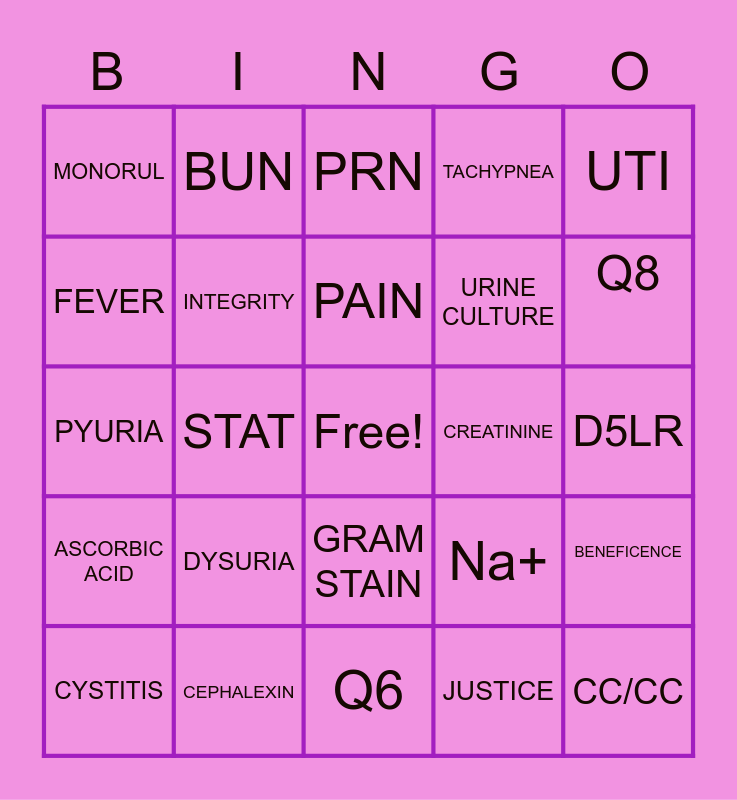 This bingo card has a free space and 24 words: DYSURIA, CEPHALEXIN, PAIN, CYSTITIS, UTI, MONORUL, FEVER, BUN, CREATININE, GRAM STAIN, URINE CULTURE, PYURIA, Na+, BENEFICENCE, INTEGRITY, JUSTICE, D5LR, PRN, Q8, STAT, CC/CC, ASCORBIC ACID, TACHYPNEA and Q6.