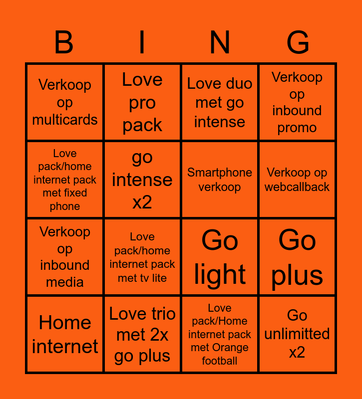 This bingo card has 16 words: Love trio met 2x go plus, Go plus, Love duo met go intense, Verkoop op multicards, Verkoop op inbound media, Love pro pack, Go light, Love pack/Home internet pack met Orange football, Love pack/home internet pack met fixed phone, go intense x2, Home internet, Verkoop op inbound promo, Love pack/home internet pack met tv lite, Verkoop op webcallback, Smartphone verkoop and Go unlimitted x2.