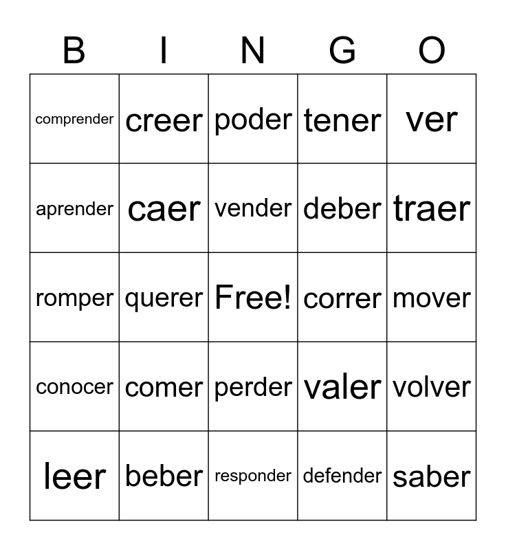 This bingo card has a free space and 24 words: comer, beber, vender, leer, ver, comprender, aprender, creer, correr, perder, deber, romper, valer, volver, caer, defender, mover, poder, traer, querer, saber, conocer, tener and responder.