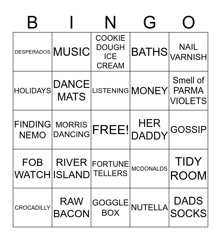 This bingo card has a free space and 24 words: RIVER ISLAND, RAW BACON, LISTENING, CROCADILLY, NAIL VARNISH, DESPERADOS, HOLIDAYS, MUSIC, HER DADDY, FORTUNE TELLERS, MONEY, FINDING NEMO, MCDONALDS, TIDY ROOM, DANCE MATS, NUTELLA, GOSSIP, COOKIE DOUGH ICE CREAM, Smell of PARMA VIOLETS, MORRIS DANCING, DADS SOCKS, FOB WATCH, BATHS and GOGGLE BOX.