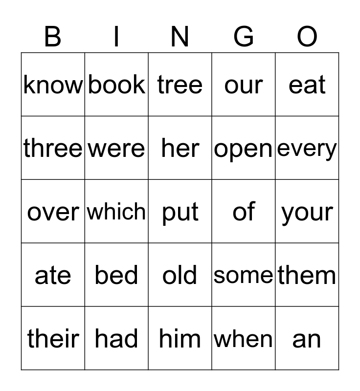 This bingo card has a free space and 24 words: bed, had, her, their, eat, know, three, book, of, old, open, over, some, them, were, when, your, tree, every, which, an, ate, our and him.