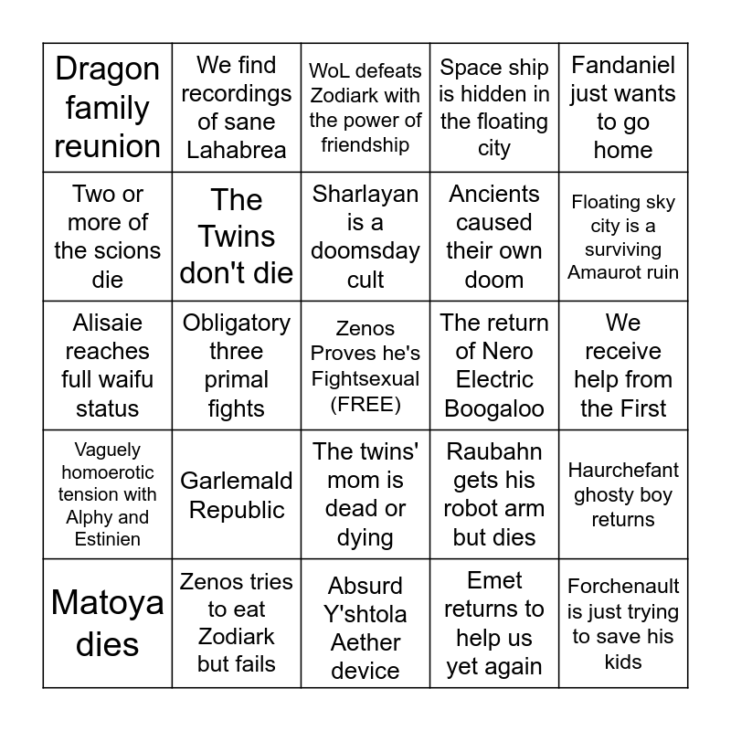 This bingo card has a free space and 24 words: Garlemald Republic, Zenos tries to eat Zodiark but fails, Sharlayan is a doomsday cult, Matoya dies, Fandaniel just wants to go home, Dragon family reunion, Two or more of the scions die, We find recordings of sane Lahabrea, The return of Nero Electric Boogaloo, The twins' mom is dead or dying, Ancients caused their own doom, Alisaie reaches full waifu status, Raubahn gets his robot arm but dies, Haurchefant ghosty boy returns, The Twins don't die, Emet returns to help us yet again, We receive help from the First, WoL defeats Zodiark with the power of friendship, Floating sky city is a surviving Amaurot ruin, Obligatory three primal fights, Forchenault is just trying to save his kids, Vaguely homoerotic tension with Alphy and Estinien, Space ship is hidden in the floating city and Absurd Y'shtola Aether device.