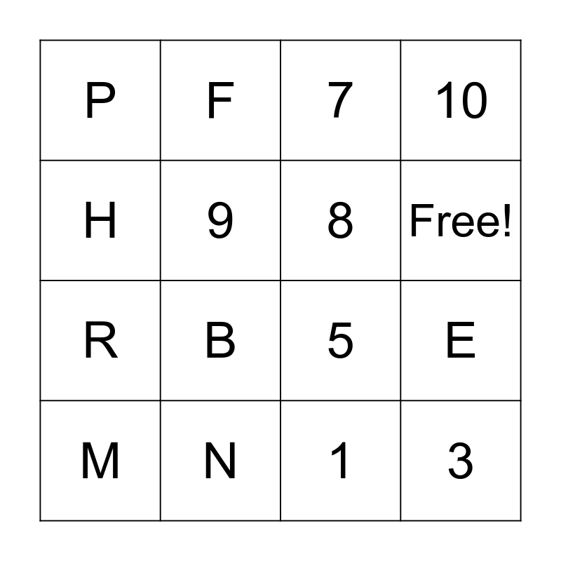 This bingo card has 17 words: 1, M, 7, P, B, 10, E, 8, Free!, 9, N, 5, H, F, R, D and 3.