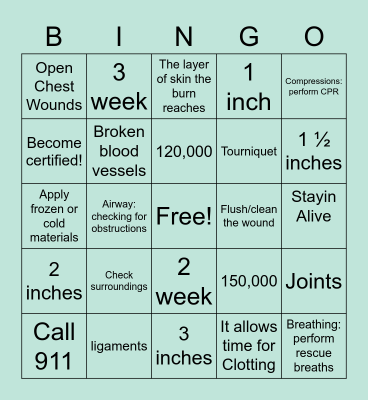 This bingo card has a free space and 29 words: Call 911, Good Samaritan Laws, Airway: checking for obstructions, Cardiopulmonary Resuscitation, Open Chest Wounds, The layer of skin the burn reaches, Broken blood vessels, Check surroundings, Flush/clean the wound, ligaments, Stayin Alive, Breathing: perform rescue breaths, 3 inches, It allows time for Clotting, 1 ½ inches, Frostbite, 2 week, 2 inches, Compressions: perform CPR, Apply frozen or cold materials, 150,000, Liquids with electrolytes, Tourniquet, Become certified!, 1 inch, 3 week, Joints, 120,000 and tendons.