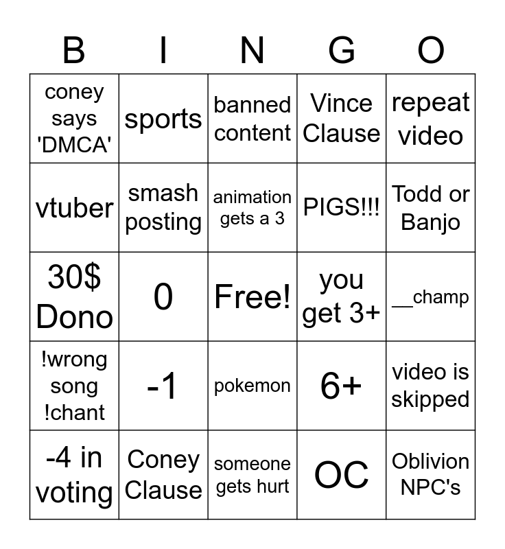This bingo card has a free space and 24 words: -1, Coney Clause, animation gets a 3, -4 in voting, repeat video, coney says 'DMCA', vtuber, sports, you get 3+, pokemon, PIGS!!!, 30$ Dono, 6+, video is skipped, smash posting, OC, __champ, banned content, Todd or Banjo, 0, Oblivion NPC's, !wrong song !chant, Vince Clause and someone gets hurt.