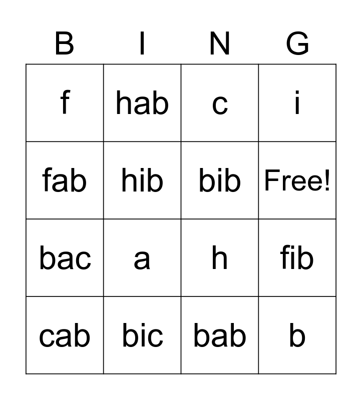This bingo card has 18 words: a, b, c, f, h, i, cab, hab, Free!, bac, bab, fab, fib, hib, bib, fic, bic and hac.