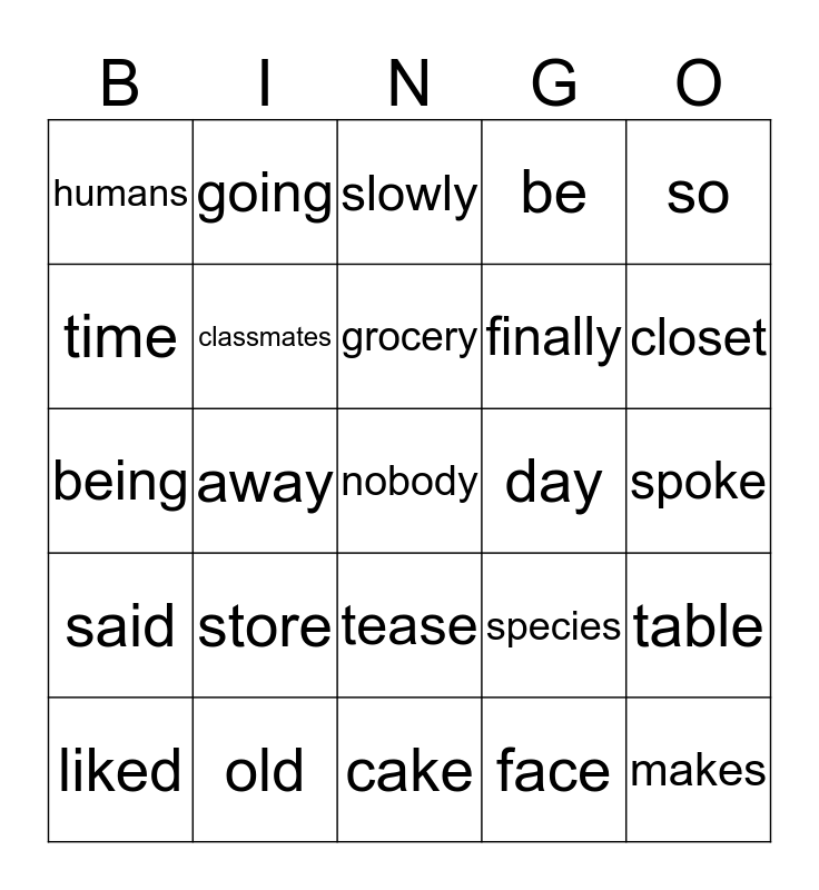 This bingo card has a free space and 24 words: store, old, grocery, liked, so, humans, time, going, day, tease, finally, being, species, table, classmates, face, spoke, slowly, closet, away, makes, said, be and cake.
