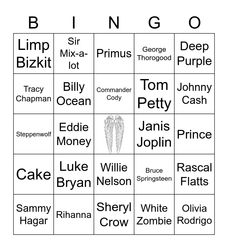 This bingo card has a free space and 36 words: Alice Cooper, Aretha Franklin, The Beatles, Billy Ocean, Bruce Springsteen, Cake, Commander Cody, The Dead Milkmen, Deep Purple, The Doobie Brothers, Eddie Money, George Thorogood, The Grateful Dead, Janis Joplin, Johnny Cash, Limp Bizkit, Lloyd Banks, Luke Bryan, Olivia Rodrigo, Primus, Prince, Rascal Flatts, Rihanna, Sammy Hagar, Sheryl Crow, Sir Mix-a-lot, Steppenwolf, Talking Heads, Tom Petty, Tracy Chapman, Van Halen, White Lion, White Zombie, Willie Nelson, Wilson Pickett and ZZ Top.