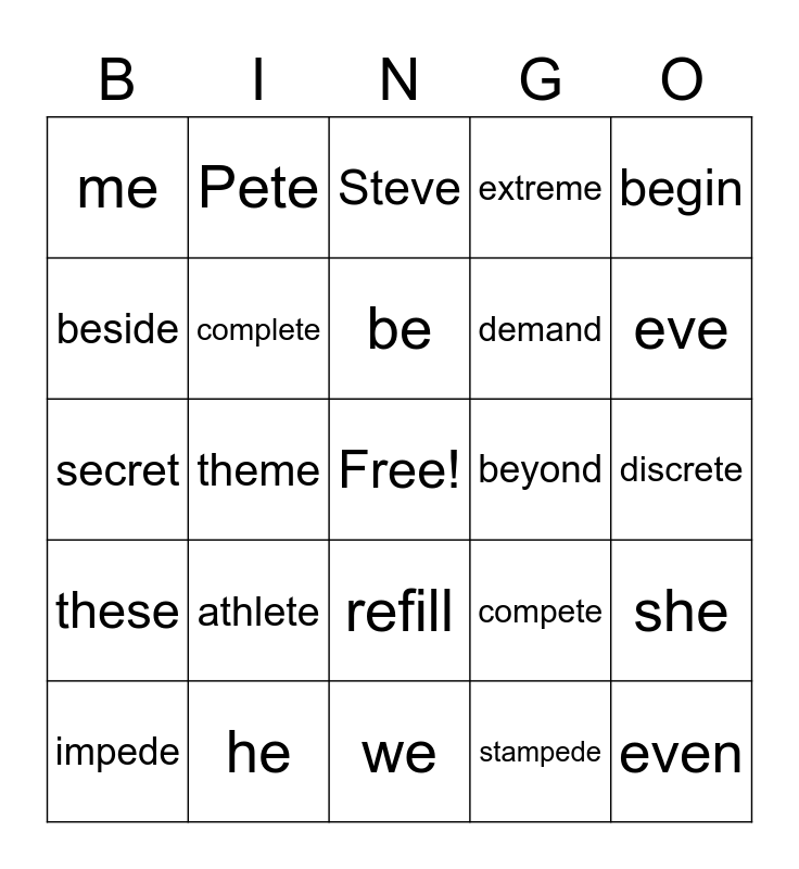 This bingo card has a free space and 24 words: athlete, he, be, impede, begin, me, beside, Pete, beyond, refill, demand, secret, compete, she, complete, stampede, discrete, Steve, eve, theme, even, these, extreme and we.