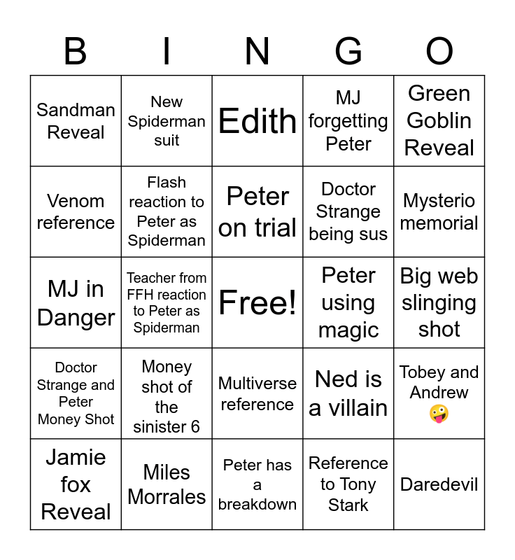 This bingo card has a free space and 24 words: Money shot of the sinister 6, Miles Morrales, Peter on trial, Jamie fox Reveal, Green Goblin Reveal, Sandman Reveal, Venom reference, New Spiderman suit, Peter using magic, Multiverse reference, Doctor Strange being sus, MJ in Danger, Ned is a villain, Tobey and Andrew 🤪, Flash reaction to Peter as Spiderman, Reference to Tony Stark, Big web slinging shot, Edith, Mysterio memorial, Teacher from FFH reaction to Peter as Spiderman, Daredevil, Doctor Strange and Peter Money Shot, MJ forgetting Peter and Peter has a breakdown.