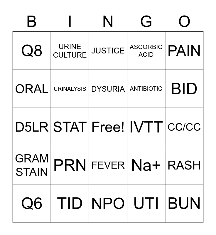 This bingo card has a free space and 24 words: PRN, TID, DYSURIA, Q6, PAIN, Q8, ORAL, URINE CULTURE, IVTT, FEVER, ANTIBIOTIC, D5LR, Na+, RASH, URINALYSIS, UTI, CC/CC, JUSTICE, BID, STAT, BUN, GRAM STAIN, ASCORBIC ACID and NPO.