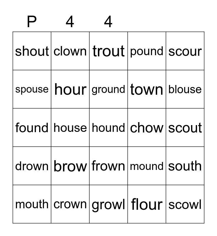 This bingo card has a free space and 24 words: brow, crown, ground, mouth, scour, shout, spouse, clown, chow, frown, town, found, mound, south, hour, flour, scout, trout, blouse, house, scowl, drown, pound and growl.