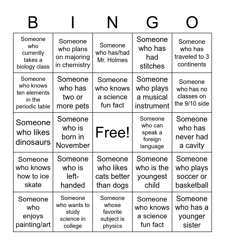 This bingo card has a free space and 24 words: Someone who is left-handed, Someone who wants to study science in college, Someone who knows a science fun fact, Someone who enjoys painting/art, Someone who has traveled to 3 continents, Someone who currently takes a biology class, Someone who knows ten elements in the periodic table, Someone who plans on majoring in chemistry, Someone who can speak a foreign language, Someone who likes cats better than dogs, Someone who plays a musical instrument, Someone who likes dinosaurs, Someone who is the youngest child, Someone who plays soccer or basketball, Someone who has two or more pets, Someone who knows a science fun fact, Someone who has never had a cavity, Someone who has/had Mr. Holmes, Someone who has no classes on the 9/10 side, Someone who is born in November, Someone who has a younger sister, Someone who knows how to ice skate, Someone who has had stitches and Someone whose favorite subject is physics.