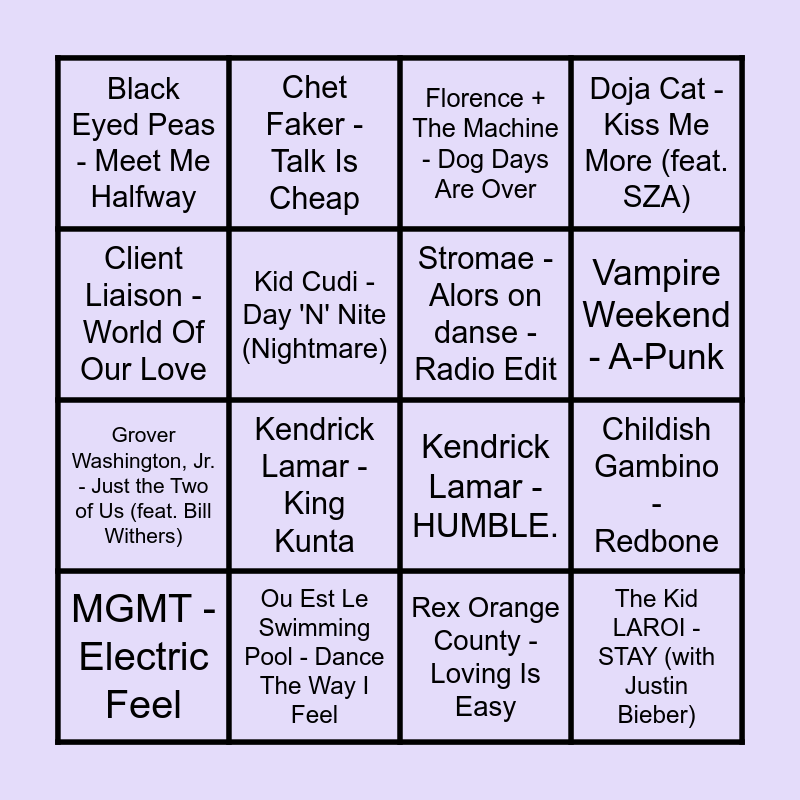 This bingo card has 61 words: Earth, Wind & Fire - Let's Groove, Rockwell - Somebody's Watching Me, Glass Animals - Heat Waves, The Kid LAROI - STAY (with Justin Bieber), Lil Nas X - INDUSTRY BABY (feat. Jack Harlow), George Michael - Careless Whisper, Stromae - Alors on danse - Radio Edit, Gym Class Heroes - Cupid's Chokehold / Breakfast in America, Grover Washington, Jr. - Just the Two of Us (feat. Bill Withers), Destiny's Child - Bills, Bills, Bills, Doja Cat - Kiss Me More (feat. SZA), Britney Spears - Gimme More, Kid Cudi - Day 'N' Nite (Nightmare), Lil Nas X - MONTERO (Call Me By Your Name), Olivia Rodrigo - good 4 u, Black Eyed Peas - Meet Me Halfway, MGMT - Electric Feel, Client Liaison - World Of Our Love, Flight Facilities - Foreign Language, Vampire Weekend - A-Punk, Ou Est Le Swimming Pool - Dance The Way I Feel, Florence + The Machine - Dog Days Are Over, Ball Park Music - It's Nice To Be Alive, The Wombats - Let's Dance to Joy Division, Prince - I Wanna Be Your Lover, Room 5 - Make Luv, Madonna - Holiday, Post Malone - Congratulations, Kendrick Lamar - King Kunta, Kanye West - Stronger, Nelly Furtado - Maneater, Touch Sensitive - Lay Down, Gang of Youths - Magnolia, Flume - Never Be Like You, Chet Faker - Talk Is Cheap, Kanye West - Runaway, M83 - Midnight City, Childish Gambino - Redbone, Disclosure - Latch, Kendrick Lamar - HUMBLE., Arctic Monkeys - Why'd You Only Call Me When You're High?, J. Cole - No Role Modelz, Rex Orange County - Loving Is Easy, THE ANXIETY - Meet Me At Our Spot, The Weeknd - Blinding Lights, Elton John - Tiny Dancer, Riton - Friday (feat. Mufasa & Hypeman) - Dopamine Re-Edit, Justin Bieber - Peaches (feat. Daniel Caesar & Giveon), Fat Joe - What's Luv? (feat. Ja-Rule & Ashanti), Rihanna - We Found Love, Tears For Fears - Everybody Wants To Rule The World, Gorillaz - Feel Good Inc., Far East Movement - Like A G6, Camila Cabello - Havana (feat. Young Thug), Joel Corry - Head & Heart (feat. MNEK), Gloria Gaynor - I Will Survive - Single Version, Genesis Owusu - Good Times, My Chemical Romance - Welcome to the Black Parade, All Time Low - Dear Maria, Count Me In, Michael Jackson - Thriller - Single Version and Elton John - Cold Heart - PNAU Remix.