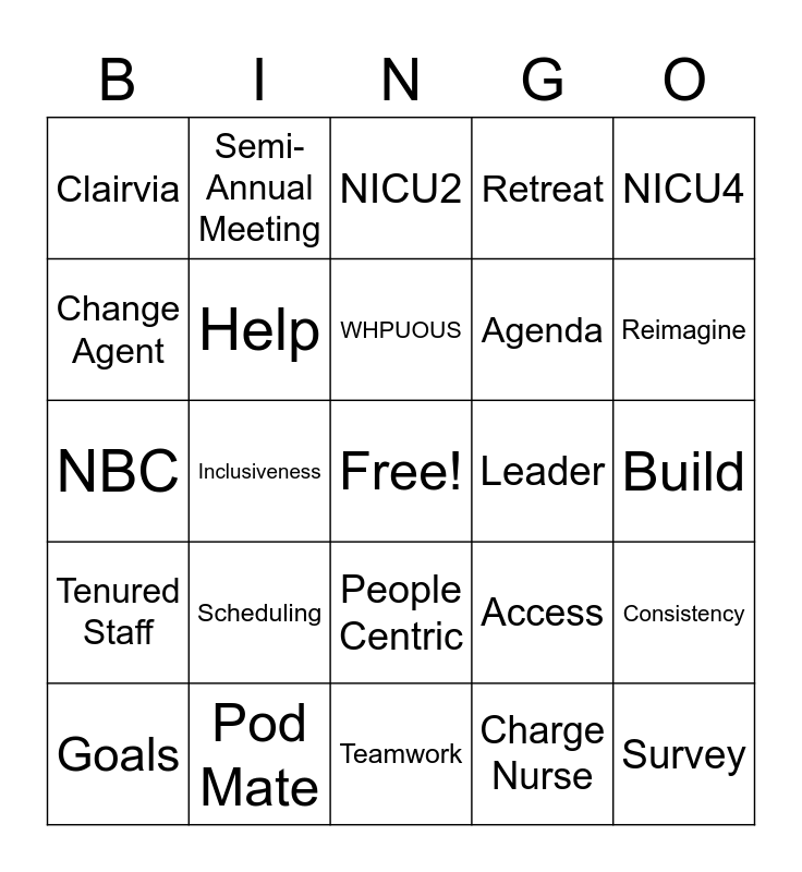 This bingo card has a free space and 34 words: Balancing, Charge Nurse, Staffing, Acuity, Tenured Staff, Help, NICU4, Goals, Semi-Annual Meeting, Floating, WHPUOUS, NICU2, Communicate, Guidelines, Leader, Reimagine, Pod Mate, NBC, Scheduling, Access, People Centric, PFW, Clairvia, Build, Teamwork, Survey, Retreat, Critical, Agenda, Change Agent, Transparency, Inclusiveness, Consistency and Innovative.