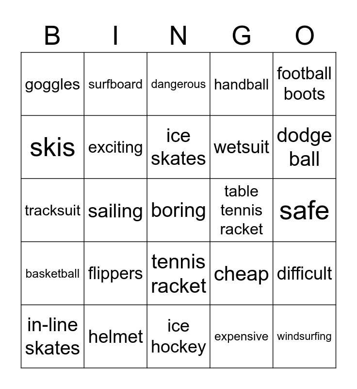 This bingo card has a free space and 24 words: flippers, helmet, ice skates, in-line skates, football boots, goggles, skis, surfboard, table tennis racket, tennis racket, wetsuit, tracksuit, cheap, difficult, exciting, expensive, safe, dangerous, dodge ball, sailing, windsurfing, basketball, handball and ice hockey.