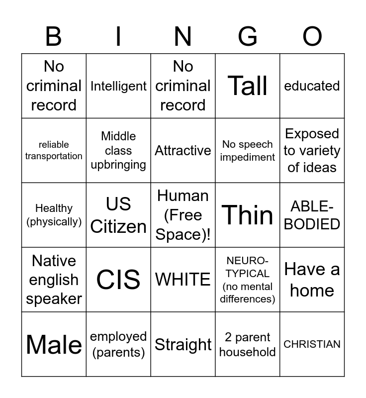 This bingo card has a free space and 24 words: Male, CIS, Attractive, 2 parent household, educated, No criminal record, Intelligent, No criminal record, Thin, ABLE-BODIED, Healthy (physically), Middle class upbringing, NEURO-TYPICAL (no mental differences), Have a home, reliable transportation, employed (parents), Straight, Tall, Exposed to variety of ideas, Native english speaker, US Citizen, WHITE, No speech impediment and CHRISTIAN.
