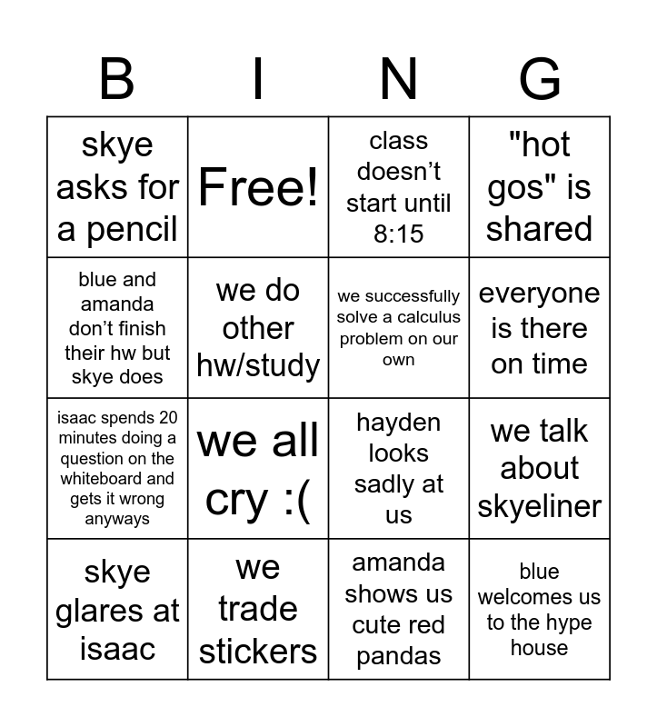 This bingo card has 20 words: we talk about skyeliner, skye moves to a different desk, class doesn’t start until 8:15, blue talks about british people, skye glares at isaac, blue and amanda don’t finish their hw but skye does, we trade stickers, skye asks for a pencil, isaac spends 20 minutes doing a question on the whiteboard and gets it wrong anyways, Free!, we all cry :(, hayden looks sadly at us, we do other hw/study, blue welcomes us to the hype house, we successfully solve a calculus problem on our own, amanda posts about us on her instagram story, everyone is there on time, "hot gos" is shared, amanda shows us cute red pandas and isaac enlightens us.