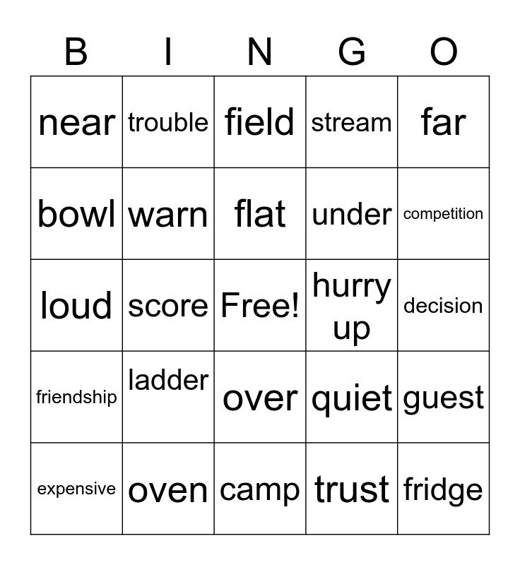 This bingo card has a free space and 24 words: ladder, oven, flat, expensive, far, near, bowl, trouble, hurry up, over, under, loud, quiet, guest, warn, trust, decision, field, competition, score, fridge, friendship, stream and camp.