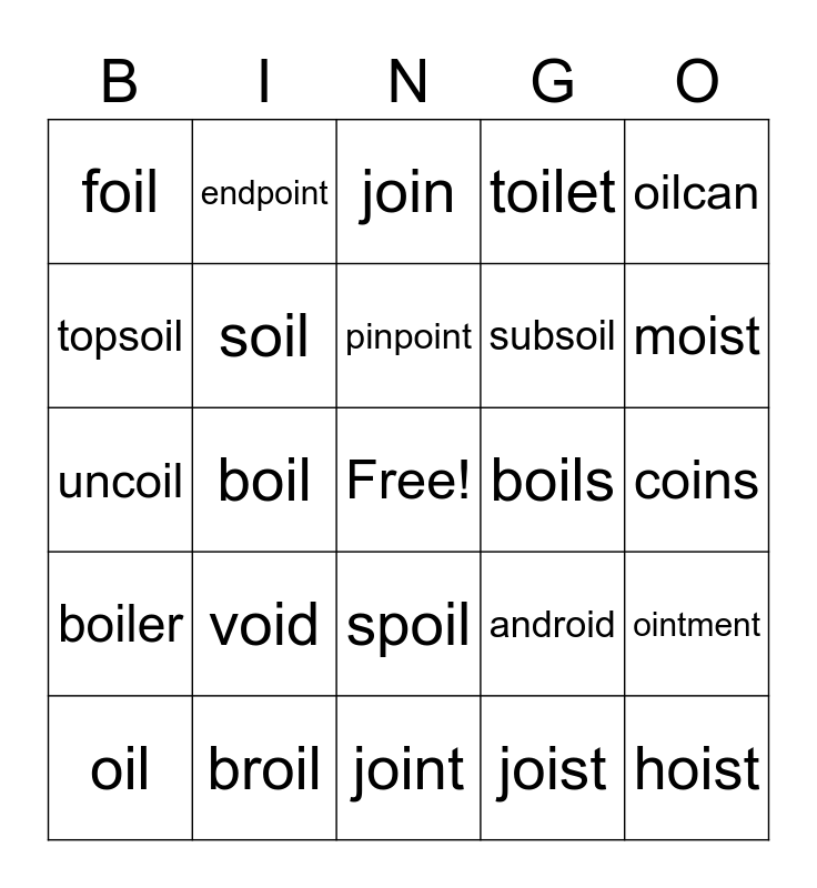 This bingo card has a free space and 29 words: oil, coil, boil, coin, foil, join, soil, void, boils, broil, coins, hoist, joint, joist, moist, point, spoil, boiler, oilcan, uncoil, android, sirloin, subsoil, topsoil, toilet, endpoint, ointment, pinpoint and midpoint.