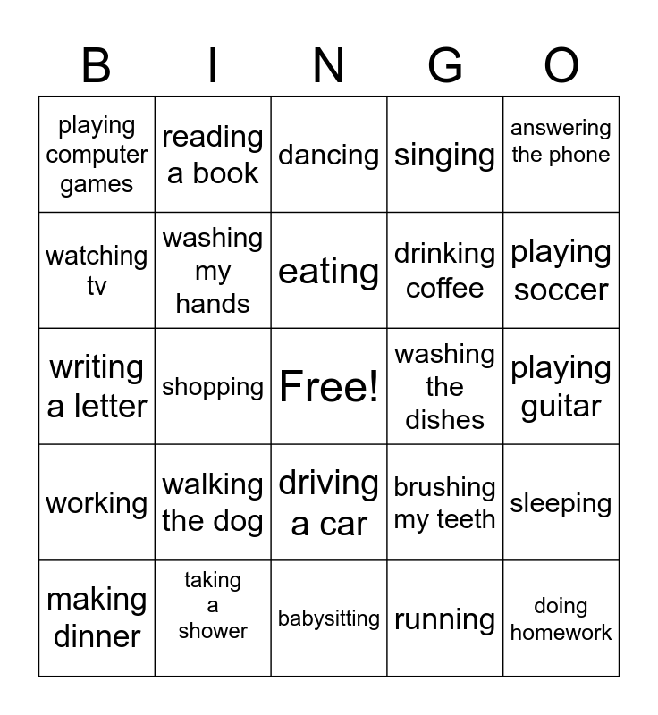 This bingo card has a free space and 24 words: walking the dog, taking a shower, eating, making dinner, answering the phone, playing computer games, watching tv, reading a book, washing the dishes, driving a car, drinking coffee, writing a letter, brushing my teeth, sleeping, washing my hands, running, playing guitar, dancing, playing soccer, shopping, doing homework, working, singing and babysitting.